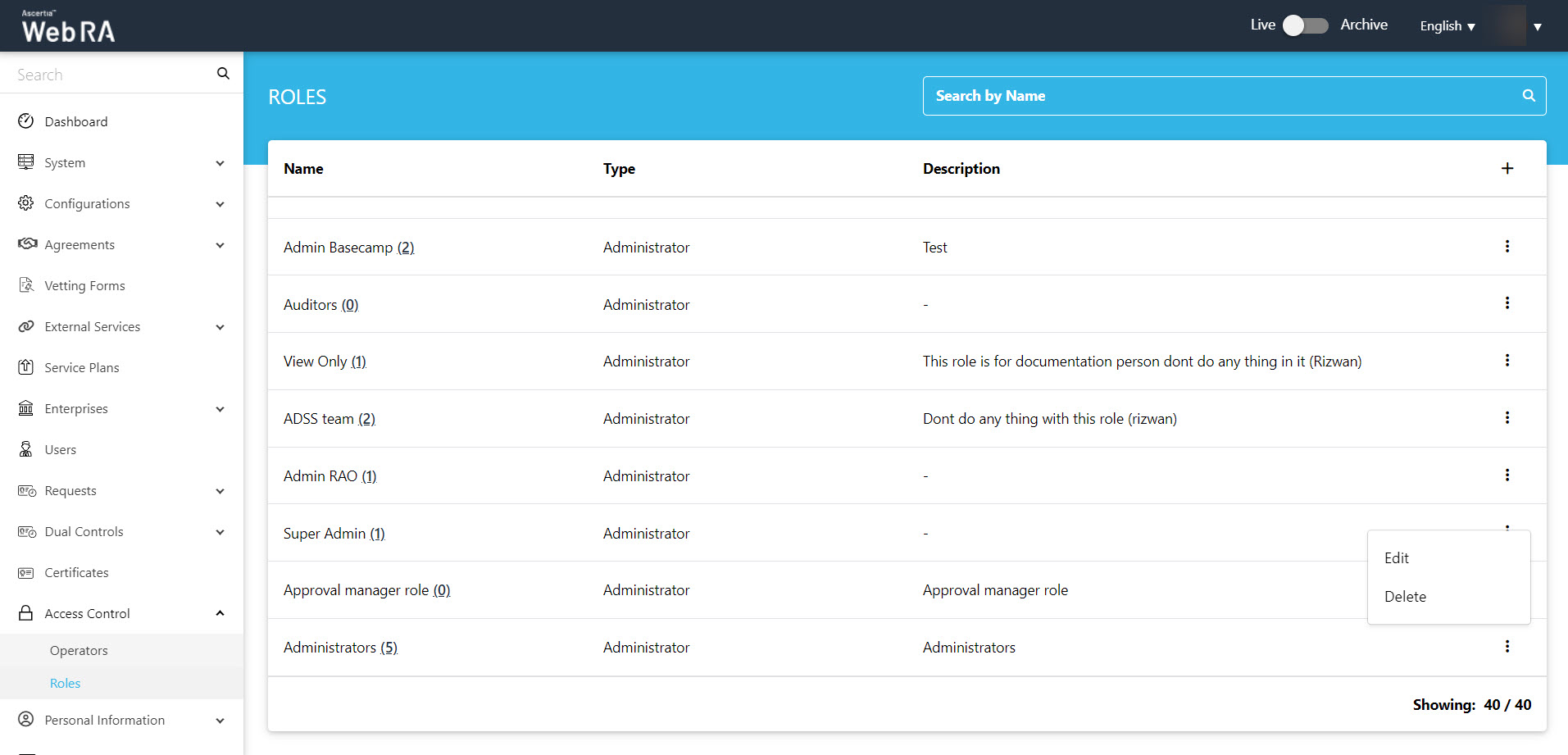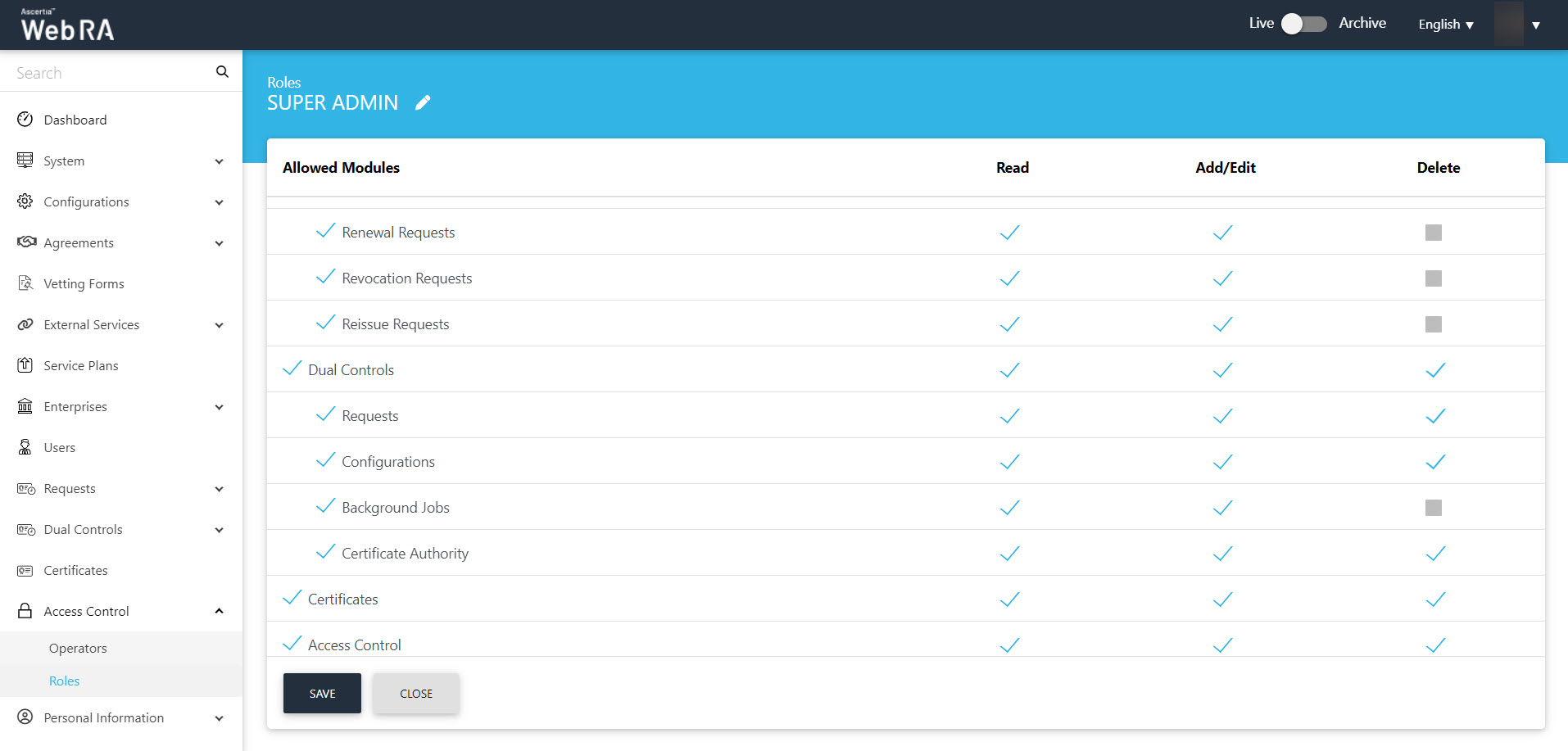 Once you have configured Dual Control in the Access Control section, certificate requests generated by an enterprise RAO will be reviewed by an Admin RAO. Admin RAO can choose to either approve or decline these requests.