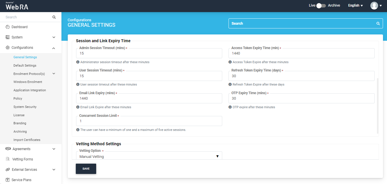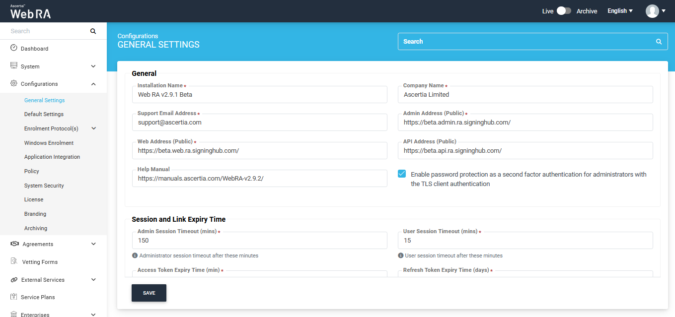 General Settings for ADSS Web RA application allows an administrator/service provider to configure application name, company name, application URLs and other basic settings to configure the application. You can go through the upcoming sections to learn about the details of each feature. To manage general settings, perform the following steps: