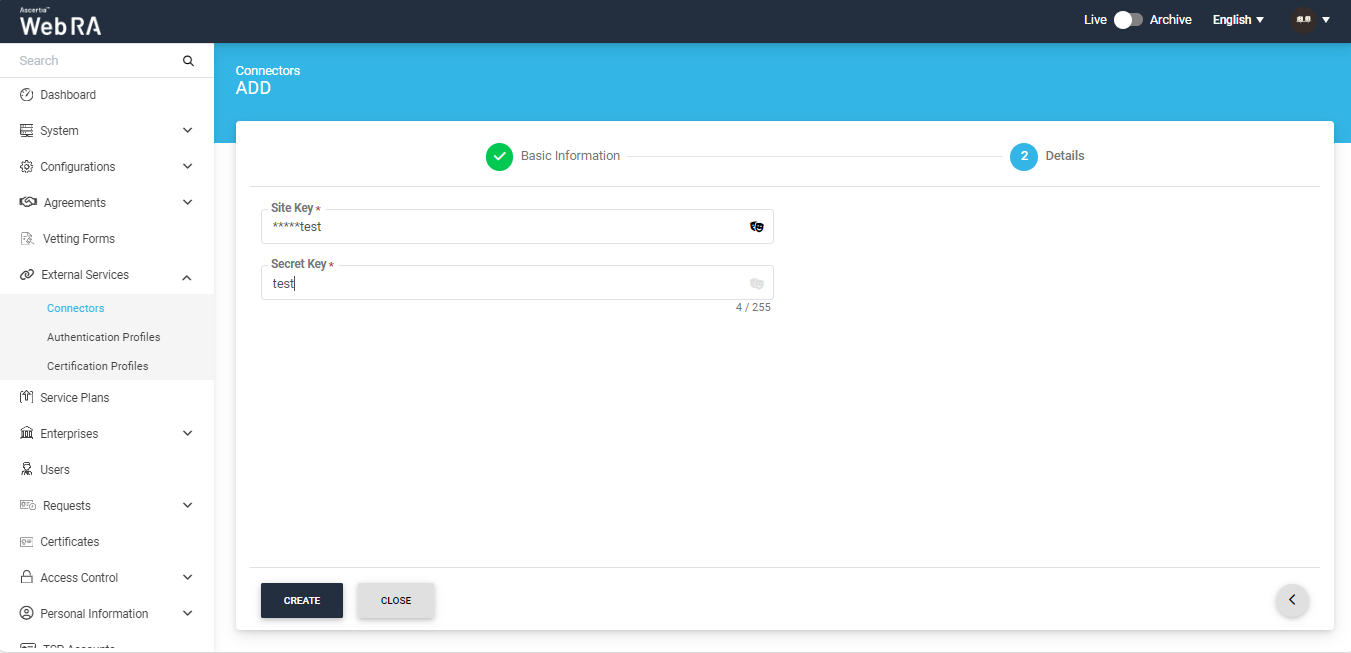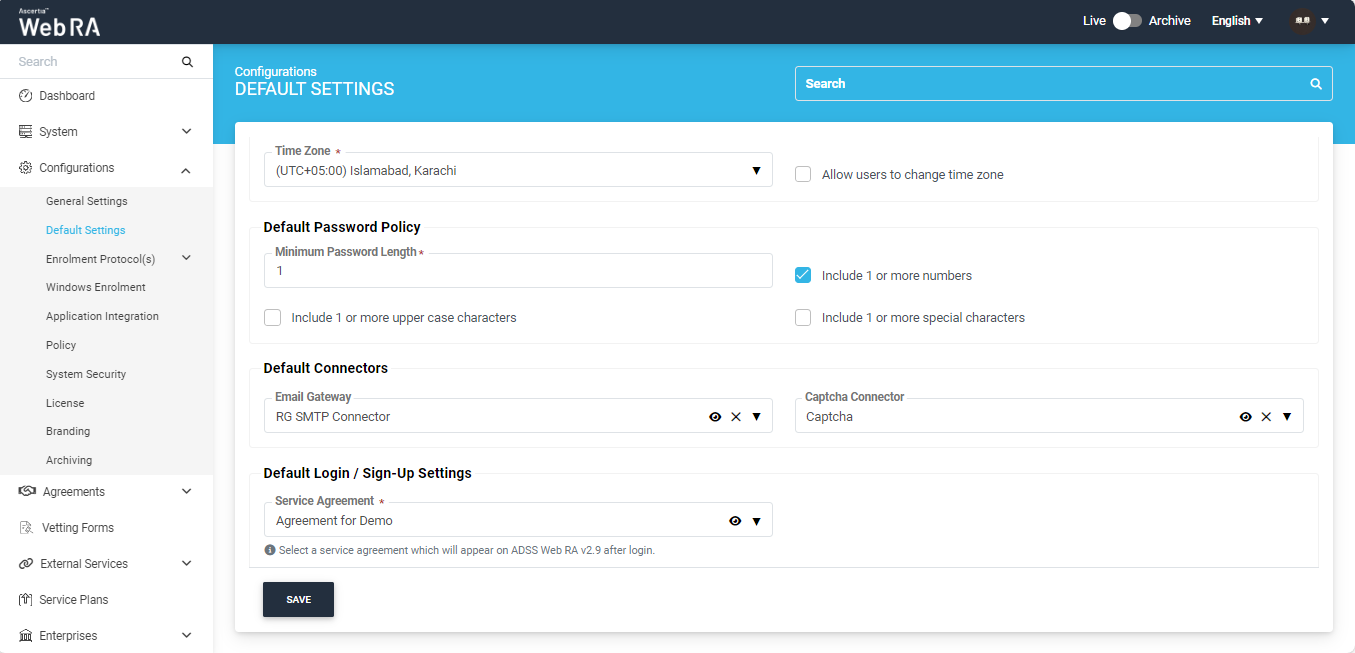 2. Under the Default Connectors, select a Google Captcha connector which you want to use in ADSS Web RA. Only active Google Captcha connectors are listed for selection.