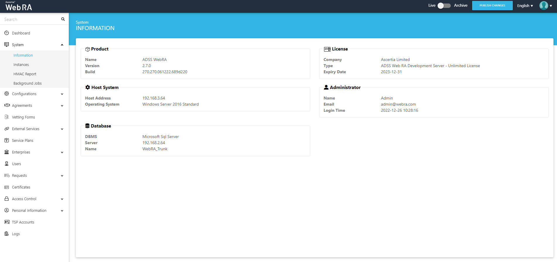Administrator - It displays the name of the administrator that is used to login to the ADSS Web RA Admin Portal, including his email address and the log in time.