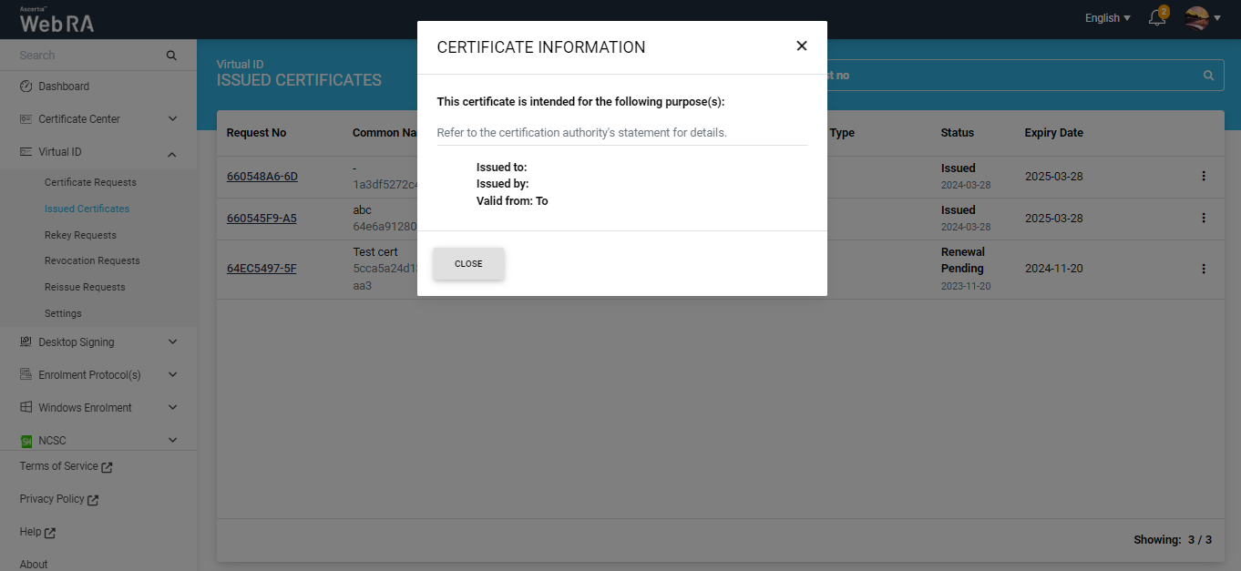 Click "View Certificate" against the certificate you want to view. The certificate information will be displayed. Then click "Close".