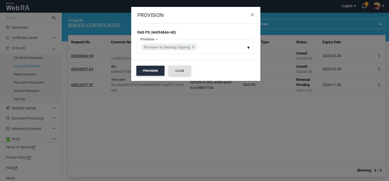Click "Provision Certificate" and the certificate will be provisioned to your Desktop Signing account.