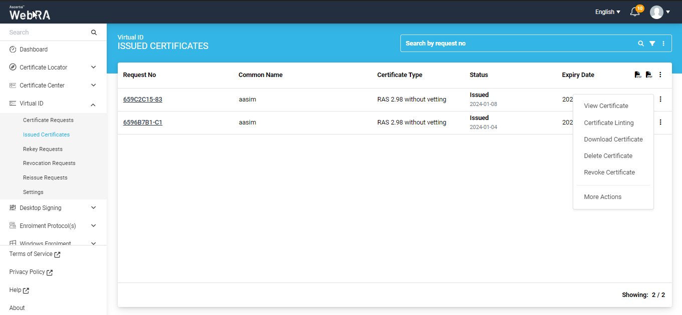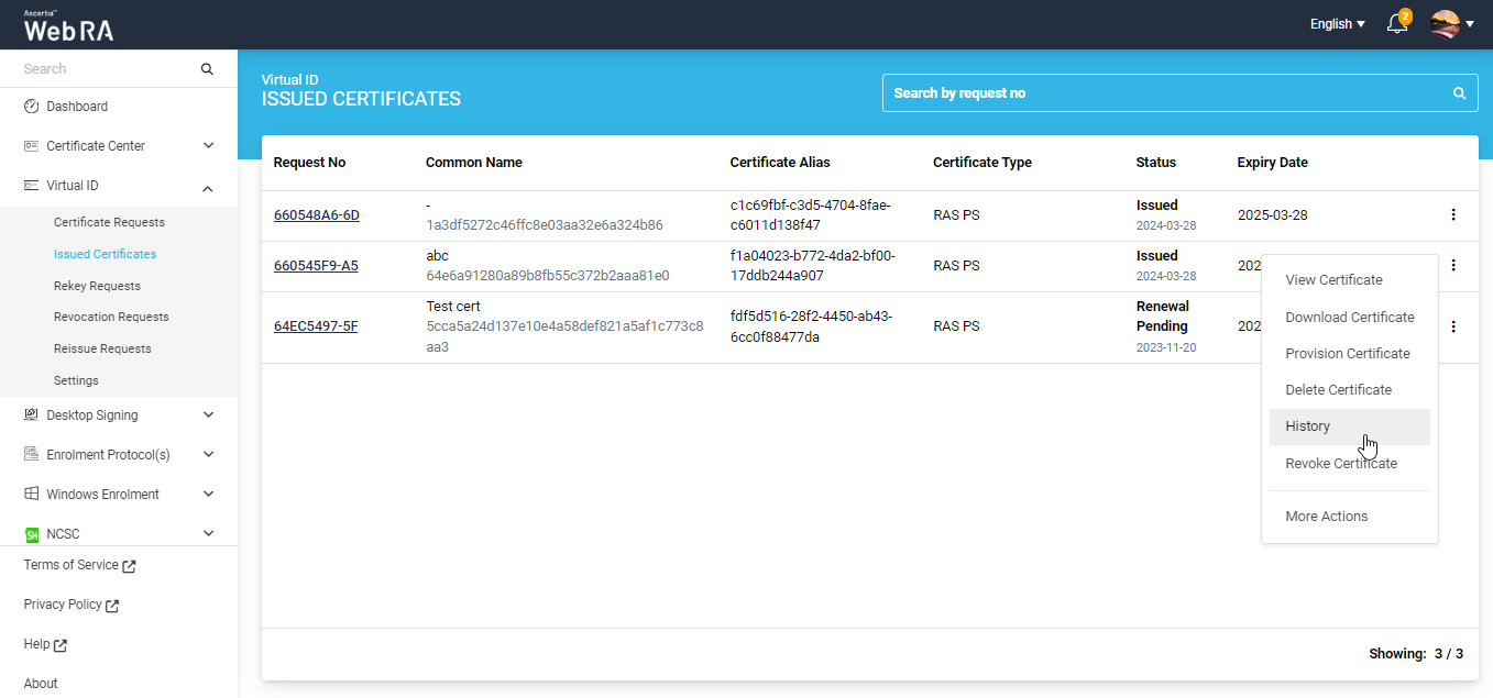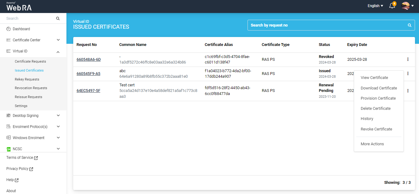Click "More Actions" to revoke, rekey, reinstate or renew a certificate as per configured in the admin portal.