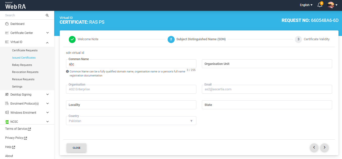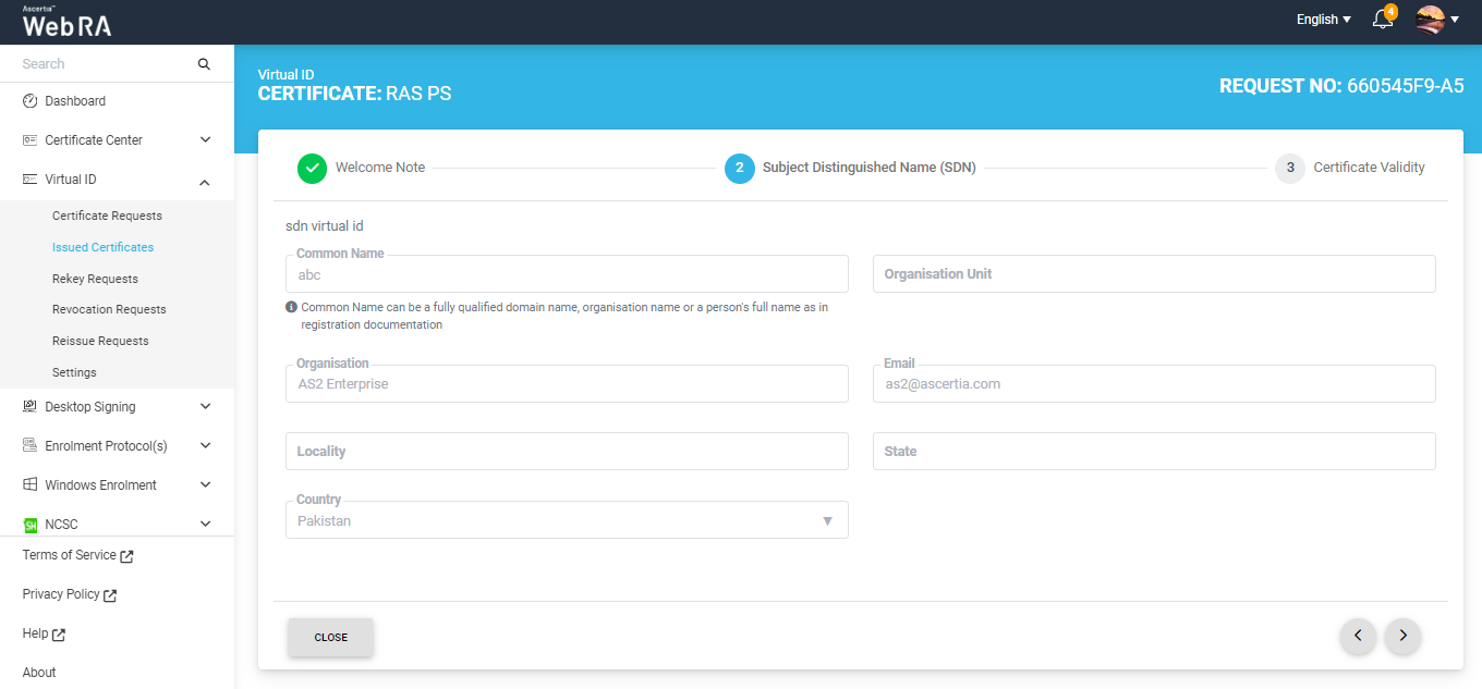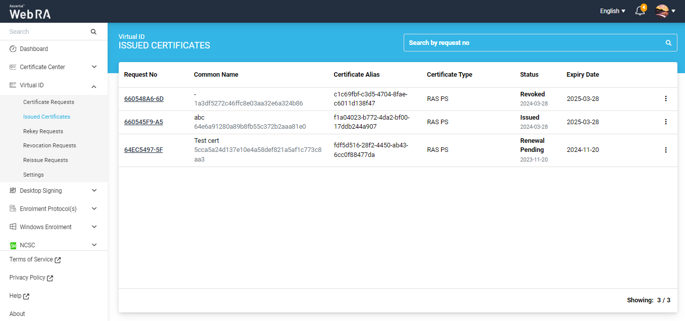 When a user registers ADSS Web RA Server with citizen ID, which is configured in the Configurations > Default Settings, he is redirected to the Virtual ID issued certificates listing. The Virtual ID and SigningHub accounts are created. Once complete, the Virtual ID certificate is created and provisioned in SigningHub.