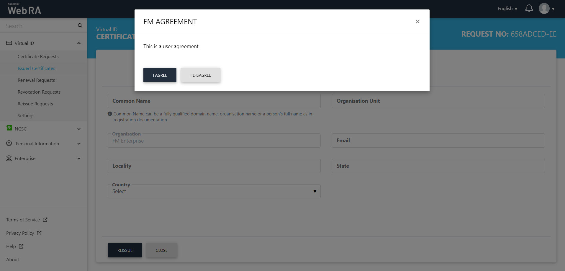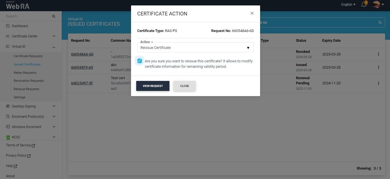 Click More Actions against a revoked certificate and the following screen will appear. Select Reissue Certificate from drop down and select the confirmation message. Then click View Request.