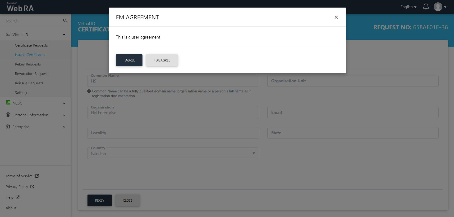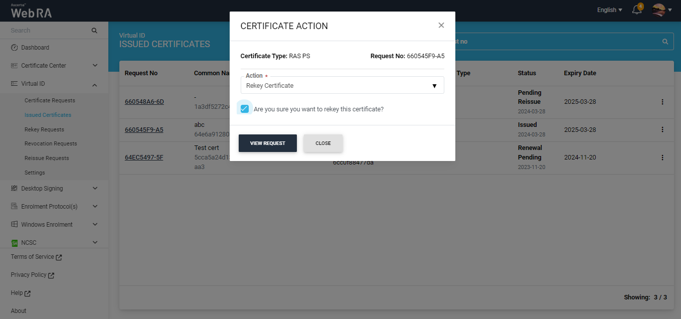 Click More Actions against a certificate and the following screen will appear. Select Rekey Certificate from drop down and select the confirmation message. Then click View Request.