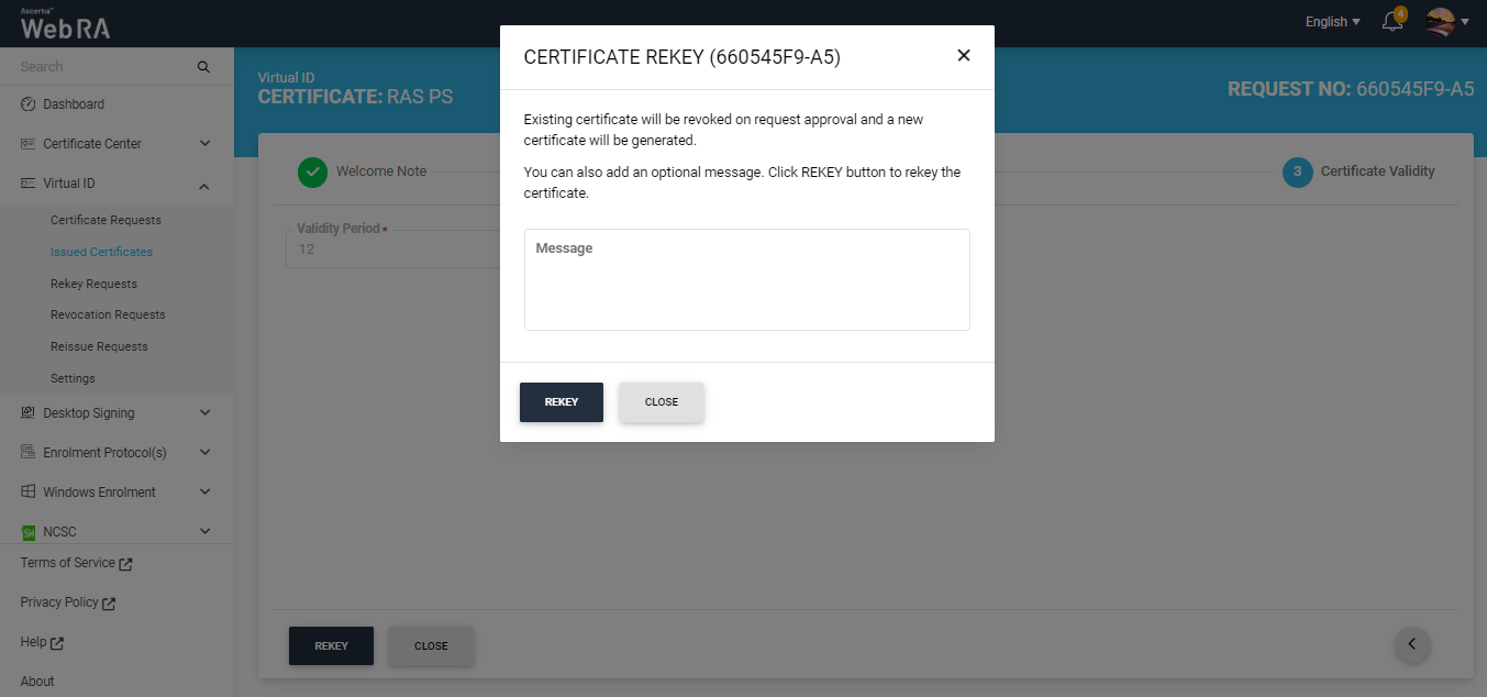 On the Certificate Rekey screen, you can add an optional message, then click Rekey.