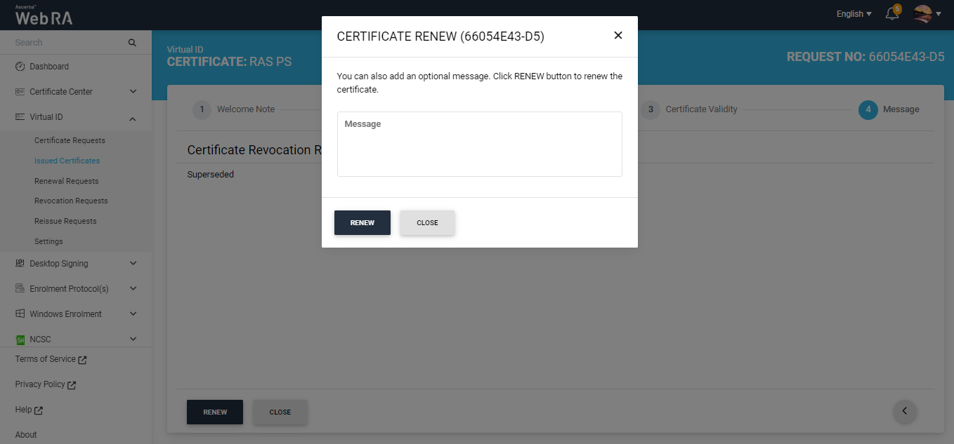 On the Certificate Renew screen, you can add an optional message, then click Renew.