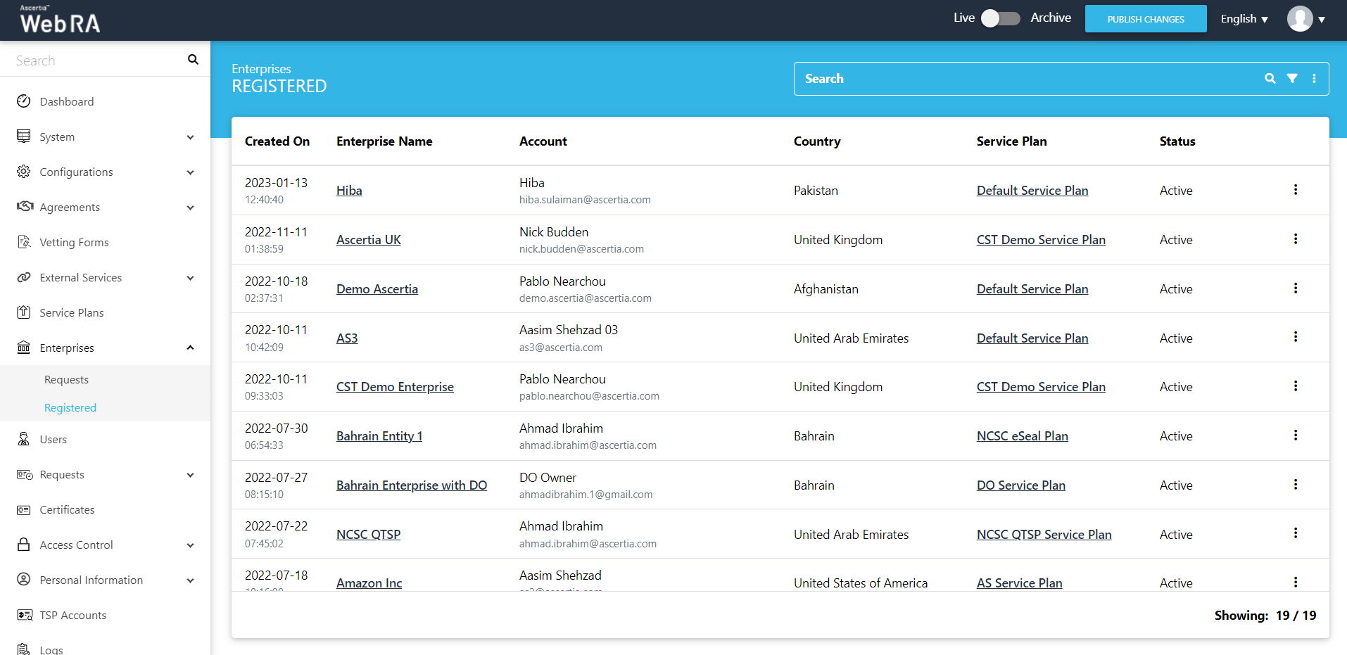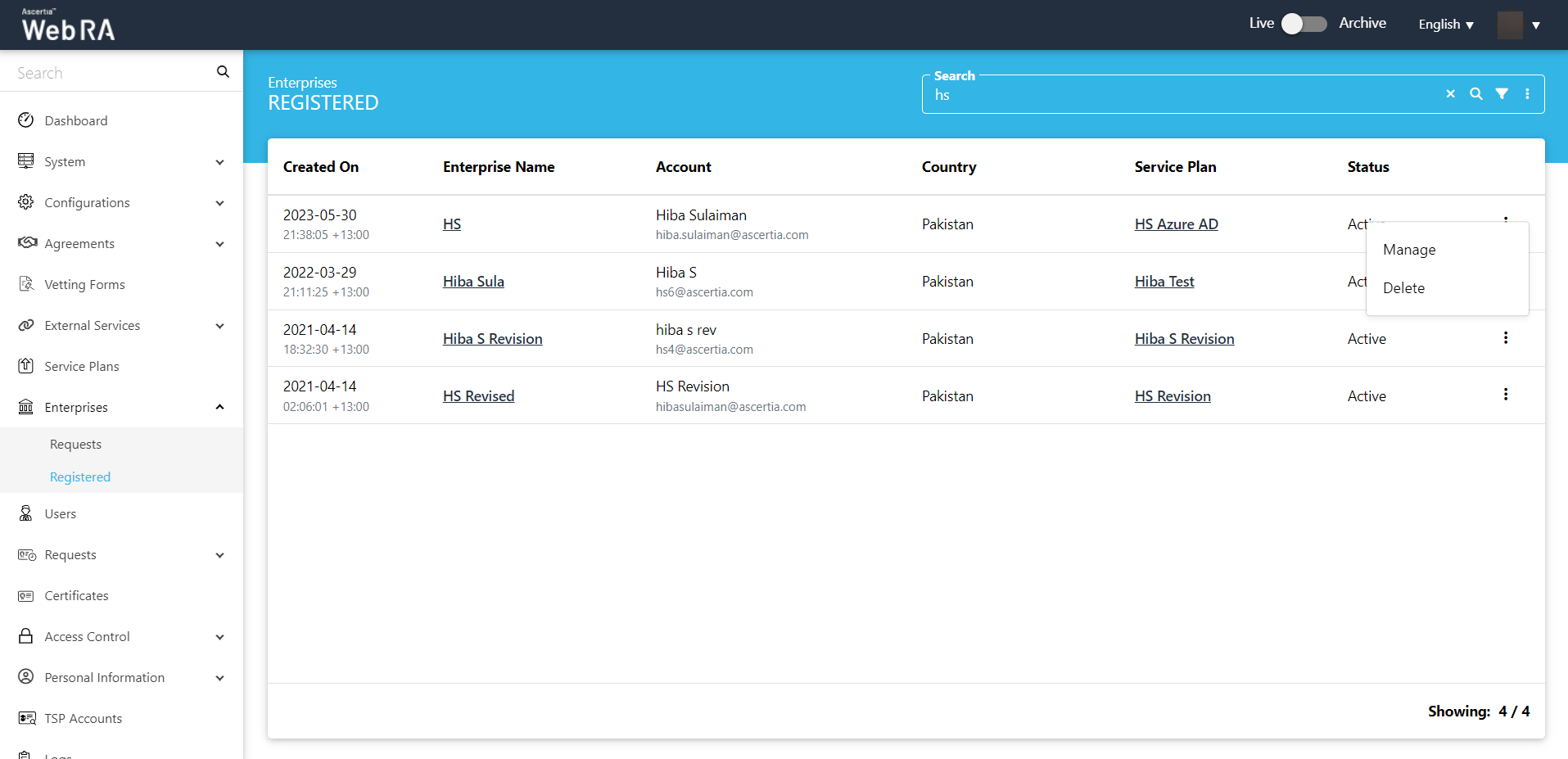 - If an enterprise is deleted, the certificates issued by/against any user of this organization will be permanently revoked and you cannot reinstate them.