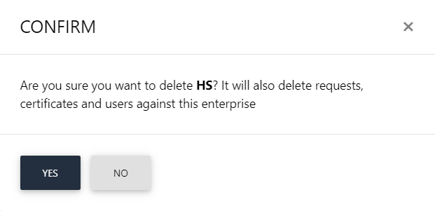 - A confirmation dialog will appear. Click "Yes". It will also delete requests, certificates and all users against this enterprise.