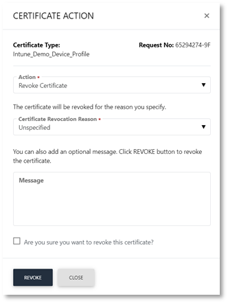 - Select Revoke Certificate, and Certificate Revocation Reason and click Revoke.