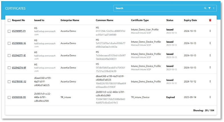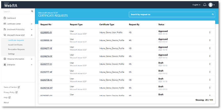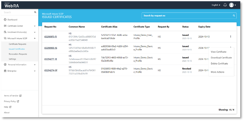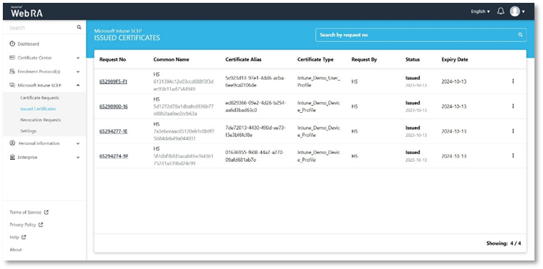 The Microsoft Intune user can view and manage the certificates from ADSS Web RA web portal.