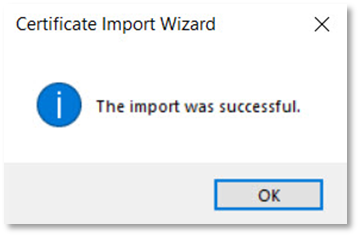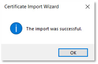 - Once your certificate is imported, the following screen will appear. Click OK.