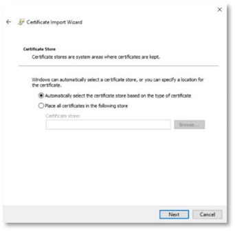 - The Certificate Store screen will appear, choose your destination folder, or select automatically select the certificate store based on the type of certificate, and click Next.