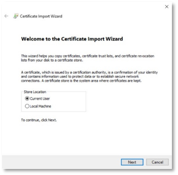 Right-click on your certificate e.g. Trusted_Certificate.cer, and click Install certificate. The Certificate Import Wizard will appear. Select the Current User and click Next.
