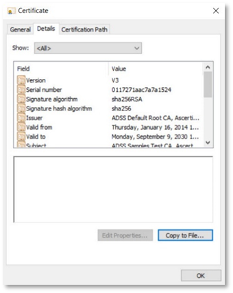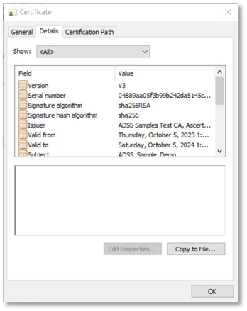 From the drop down, select the certificate e.g. ADSS_Sample_for_Demo, and click OK.