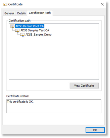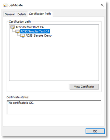 - Double-click on your certificate > Open file > Certification Path. Then click View Certificate against the ADSS Default Root CA.