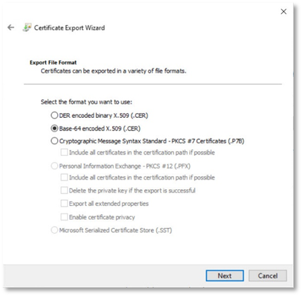 - Select the export file format as Base-64 encoded X.509 (.CER) and click Next.
