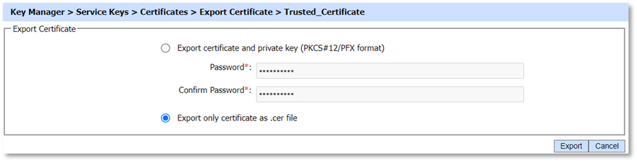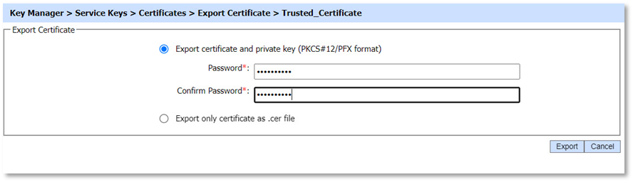 - To export a private key and its associated certificate, click the Export button in the Certificates screen. The following form is presented.