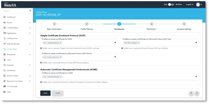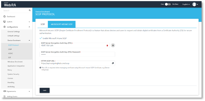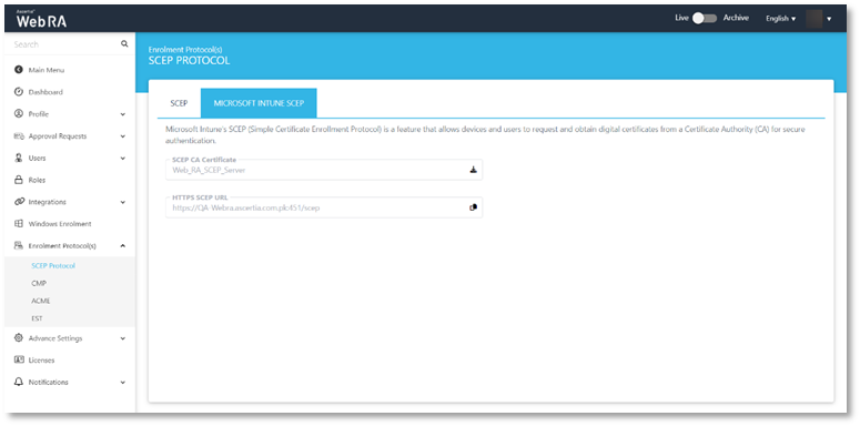The Microsoft Intune SCEP feature will only be available when the administrator installs the latest ADSS Web RA Server package from the installer.