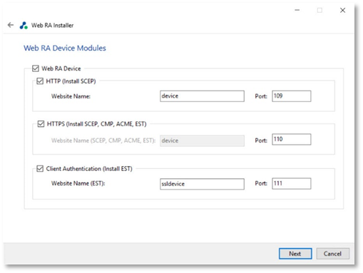 - The Web RA Device Modules dialog will display, Select the Web RA Device checkbox. Click Next. For each selected application, provide the web application name and port. Click Next to proceed.