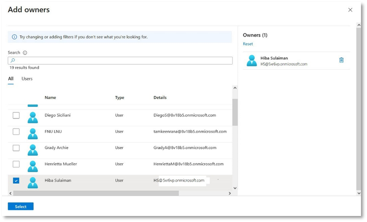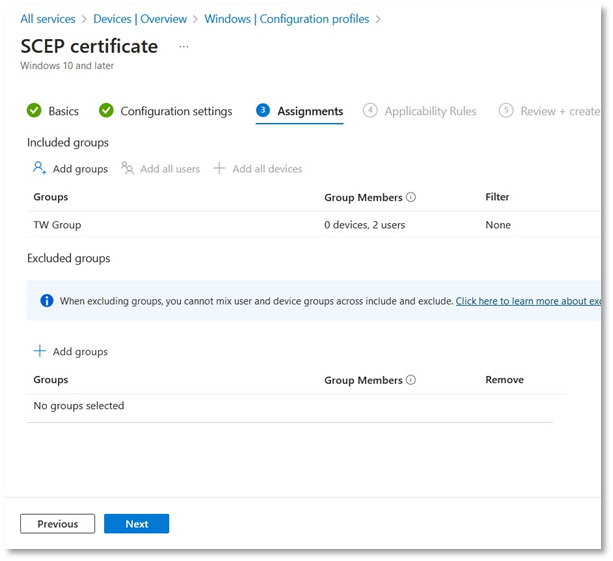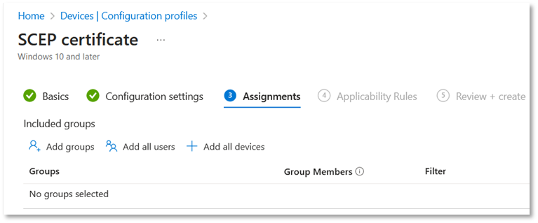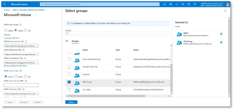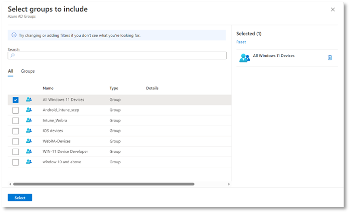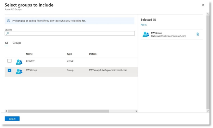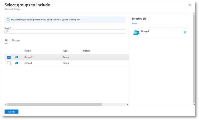 - In the Assignments tab, click Add groups, then select your relevant group e.g. Group 2 and click Select.