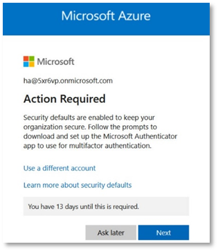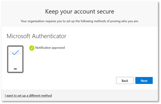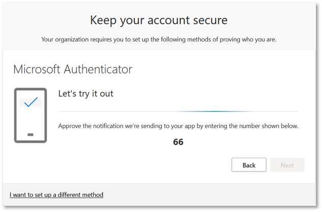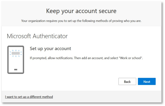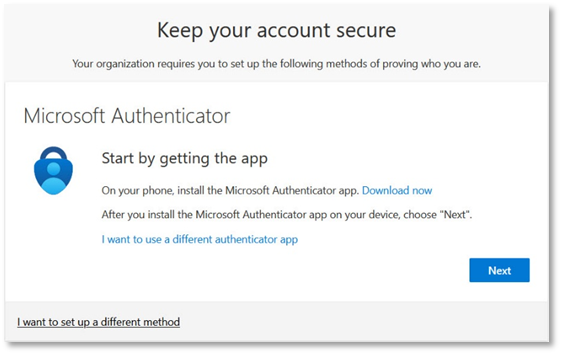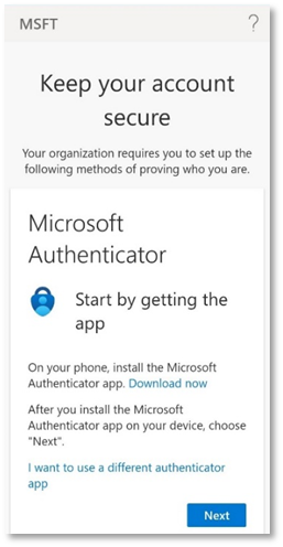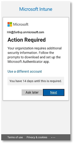 - If you have not followed the Windows enrolment for Microsoft Intune, and have not set up the Authenticator, the following will appear. Click Next.