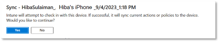 - Once your iOS device is linked with Intune, in the list of devices you manage, select the iOS device to open its Overview pane, and then select Sync.