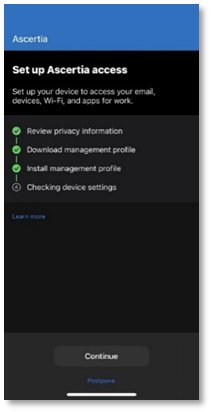 - The set up organization access screen will appear, tap Continue.