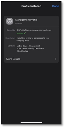- Once the profile is installed, tap Done. Open the Company Portal app again.