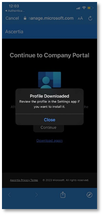 - Once the profile is downloaded, the following confirmation message will pop-up, tap Close.