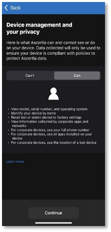- Review what your organization can and cannot see. Then tap Continue.