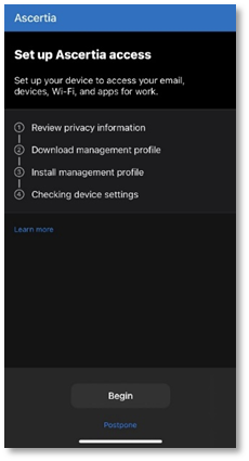- Tap Begin to enrol your device.
