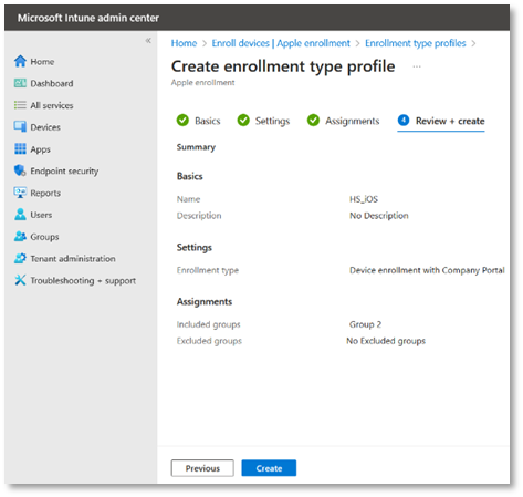 - From the Enrolment Options, click Enrolment Types. Then click Create profile. Select iOS/ iPadOS.