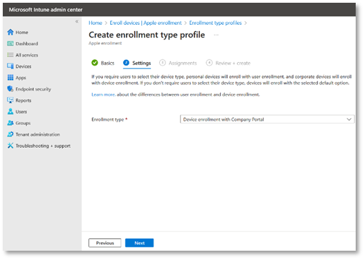 - In the Settings tab, select Device enrolment with Company Portal from the drop down, and click Next.