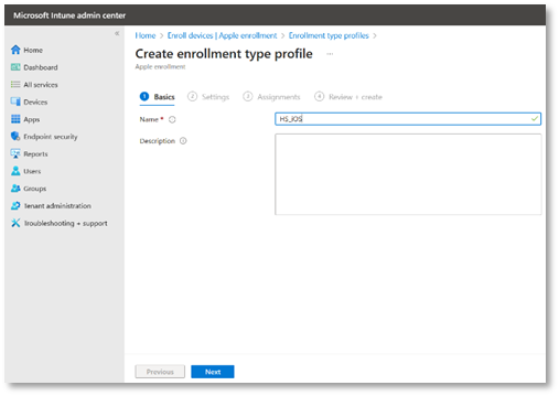 - In the Basics tab, set a profile name for the iOS Certificate e.g. HS_iOS. Then click Next.