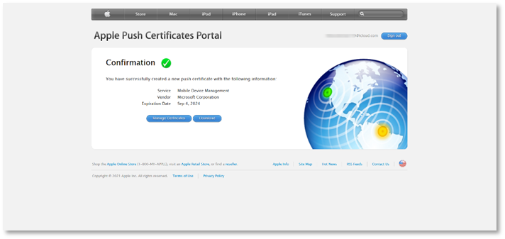 - The confirmation screen will appear, where you can manage certificates or download it.