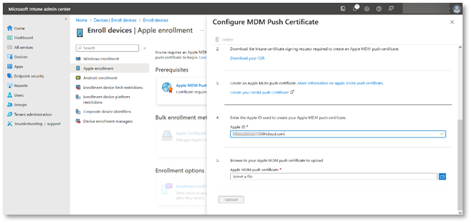 - Upload your Apple MDM push certificate and then click Upload. Once the upload is complete, all the enrolment methods will be enabled.