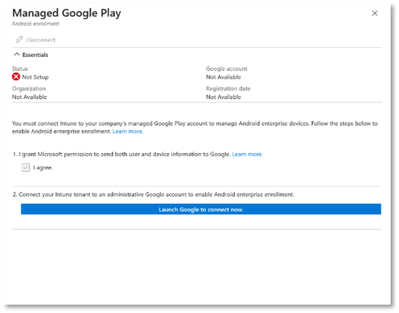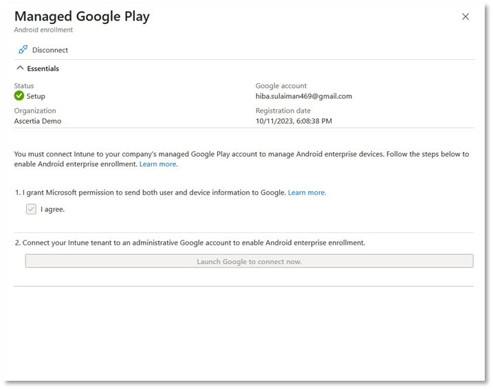 - Intune will redirect you to the Managed Google Play tab with the status Setup. If it does not redirect you automatically, you can switch to the Microsoft Intune admin center, the status will appear as Setup.