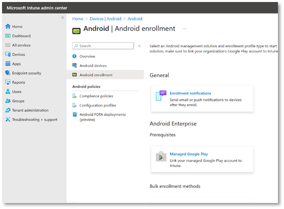 - From the left menu, click Devices > Android > Android enrollment.