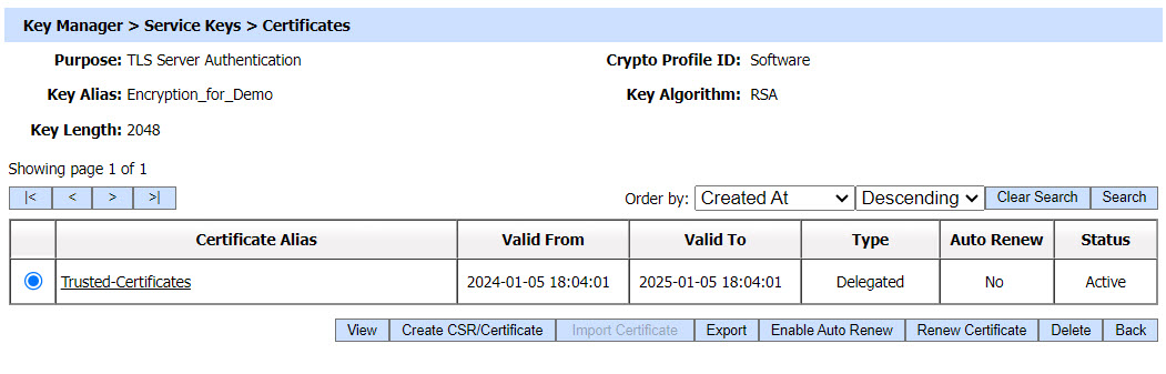 - Click on the key pair you created above, e.g. Encryption_for_Demo, then click Create CSR/Certificate.