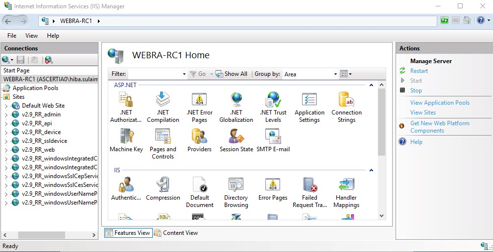 To stop the IIS Server, launch the IIS Server and click Stop under the Manage Server action.