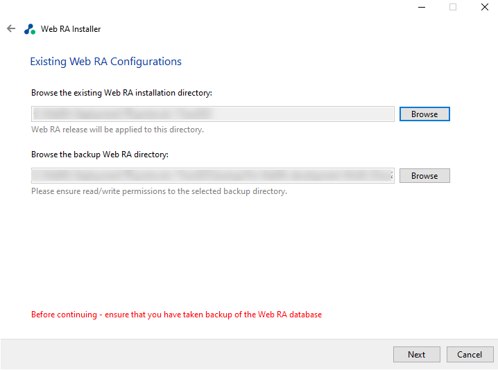 By default, when the existing Web RA installation directory address is selected, the installer will automatically create a backup Web RA folder and select it as backup directory. However, if the user wants to change the backup directory, they can click "Browse" and manually select the backup directory.
