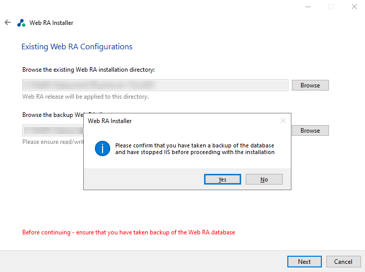 Click the Yes button to confirm that you have taken a backup of the database and have stopped the IIS before proceeding with the installation: