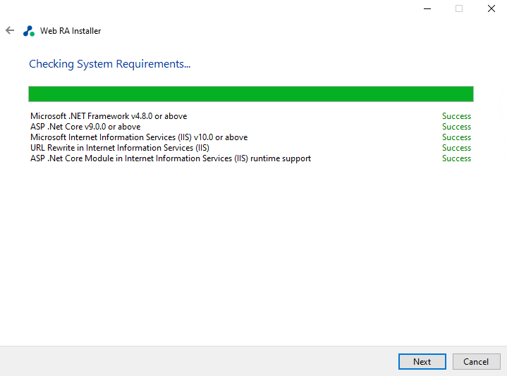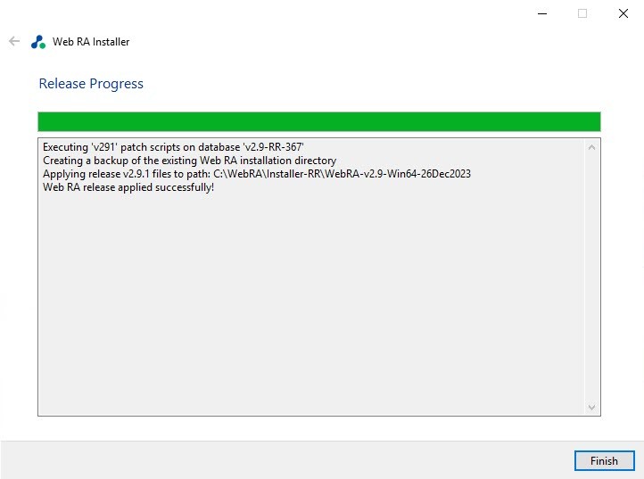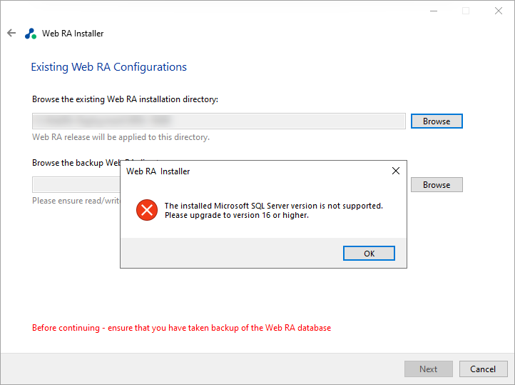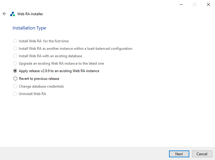 Note: To apply release v2.9.8 or above to an existing Web RA instance, Microsoft SQL Server 2022 or later is required.