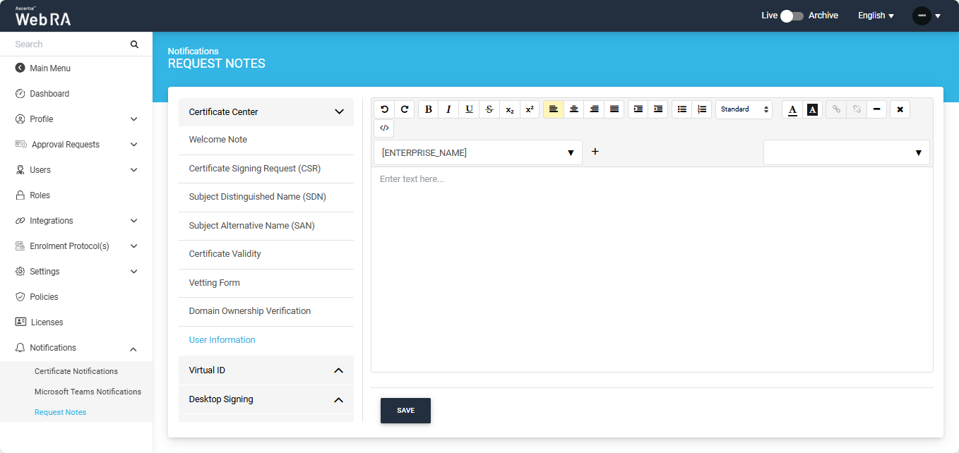 An operator can add customisable request notes to guide users through each step in the certificate creation process. They can choose to add text to any/all steps of creating certificate requests.