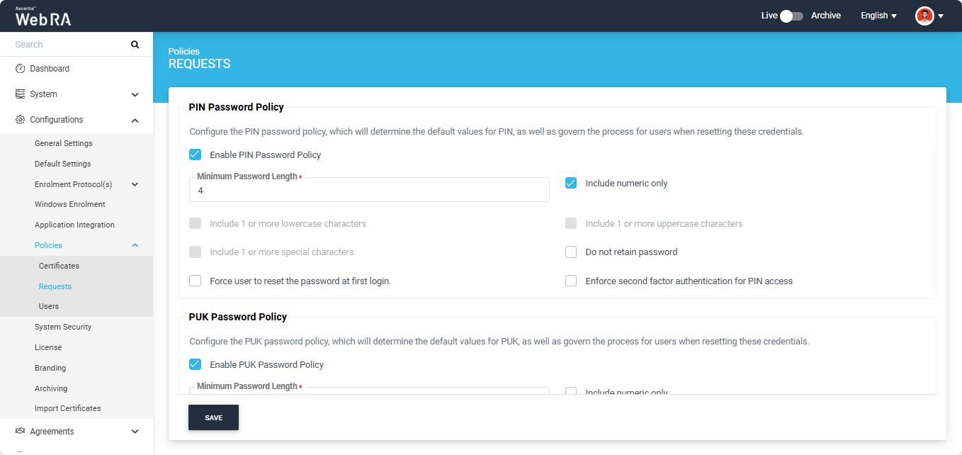 When the operator enables the ‘Enable PUK Password Policy’ checkbox, the following fields will appear.