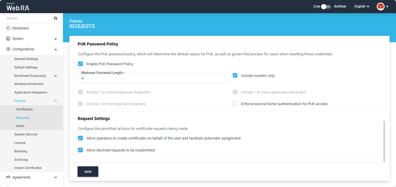 This section allows operators to configure the permitted actions for certificate requests.