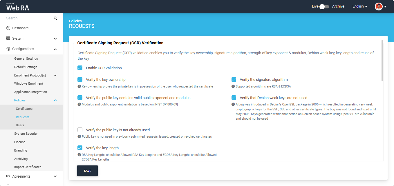 Certificate Signing Request (CSR) verification settings allows you to verify the key ownership, signature algorithm, strength of key exponents & modulus, Debian weak key, key lengths and key reuse while creating a CSR certificate on web portal.