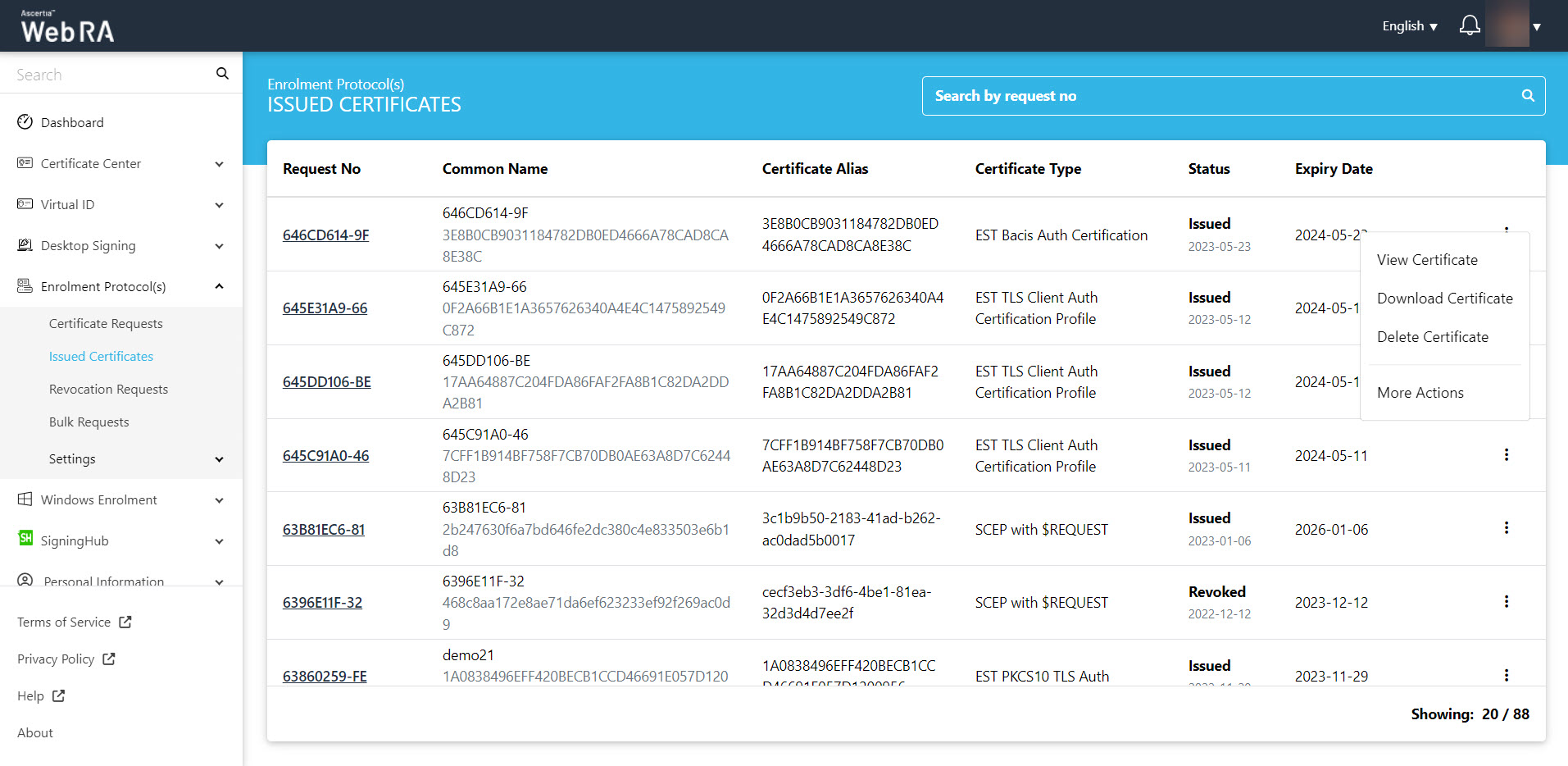 This section lists all the certificate revocation requests pertaining to device enrolment.
